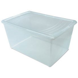 Conveniently and safely store clothing toys dry goods and more with this Clear Plastic Storage Box. This plastic storage container features transparent walls which allows you to easily identify the contents of these storage units and also feature snap on lids which securely hold stored items in the boxes. These storage containers also feature a stackable design which enables the vertical storage space in a closet garage pantry or workshop to be fully utilized. These storage boxes are available individually or in sets of six. Clear Plastic Box Features Durable polypropylene construction is built for years of use. Snap on lid keeps the contents of these plastic storage containers firmly secured. Simply squeeze handles and roll under to ensure the lid snaps in place. Stacking design allows you to maximize the utility of vertical storage space in closets cabinets garages attics and more. Large 24.25 x 12 x 16 inch plastic storage container is an ideal size for storing sweaters s